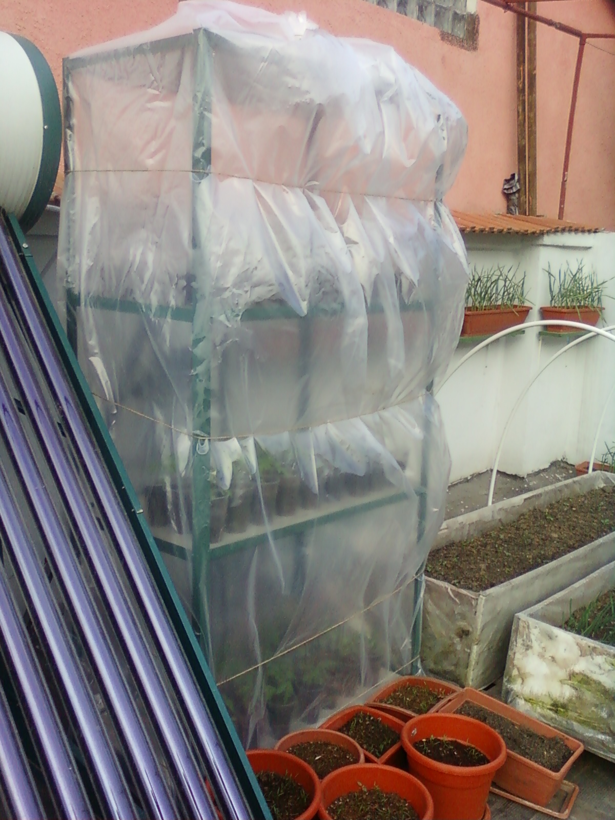 Dimineata vine lumina din dreapta, dar de la pranz incolo, lumina vine din fata si rafturile se scalda in soare pana pe la 5-6 dupa amiaza. Dupa ce se termina cu rasadurile, voi pune in el jardiniere cu salata, ridichi etc. Voi vedea. Seara imbracam totul cu un ciorap din folie de polietilena. Asa am facut si asta seara, dar mai devreme putin, din cauza furtunii. Vantul imi ciufulise de tot rosioarele. In plus, a trebuit sa legam totul cu sfoara si sa punem ghivece mai grele la baza ca sa nu o umfle vantul.